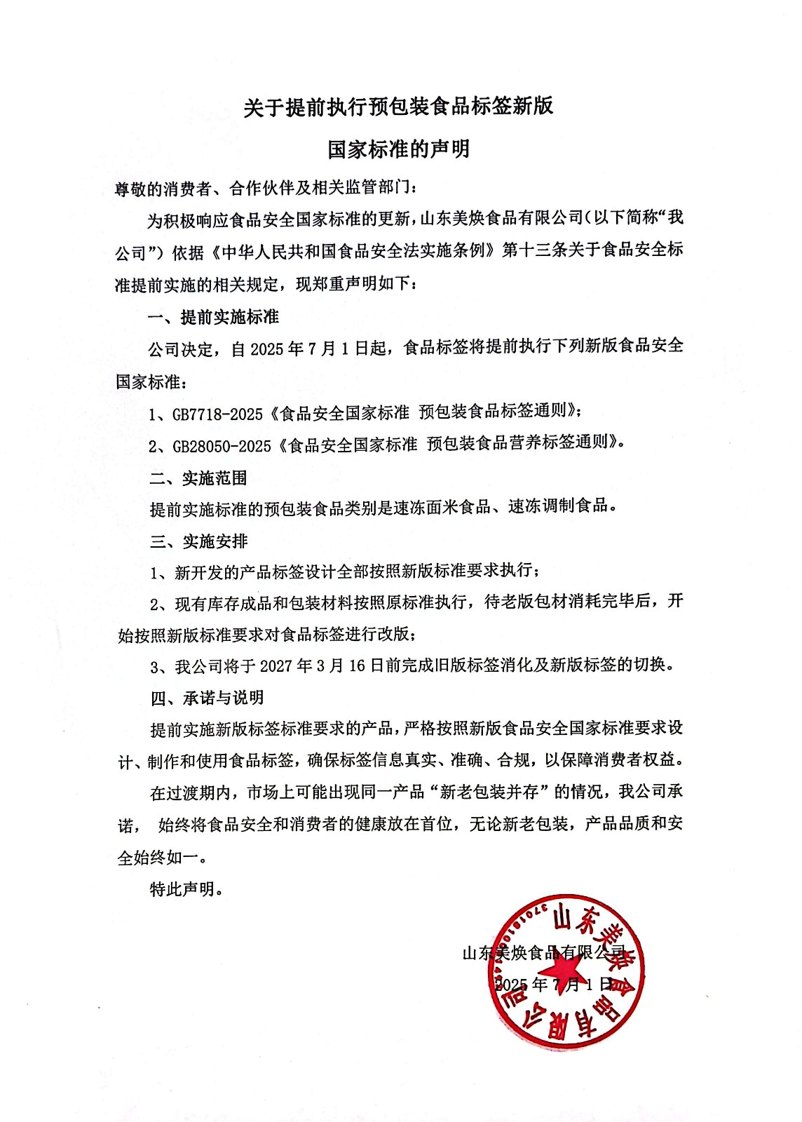 關于提前執行預包裝食品標簽新版 國家標準的聲明關于提前執行預包裝食品標簽新版 國家標準的聲明